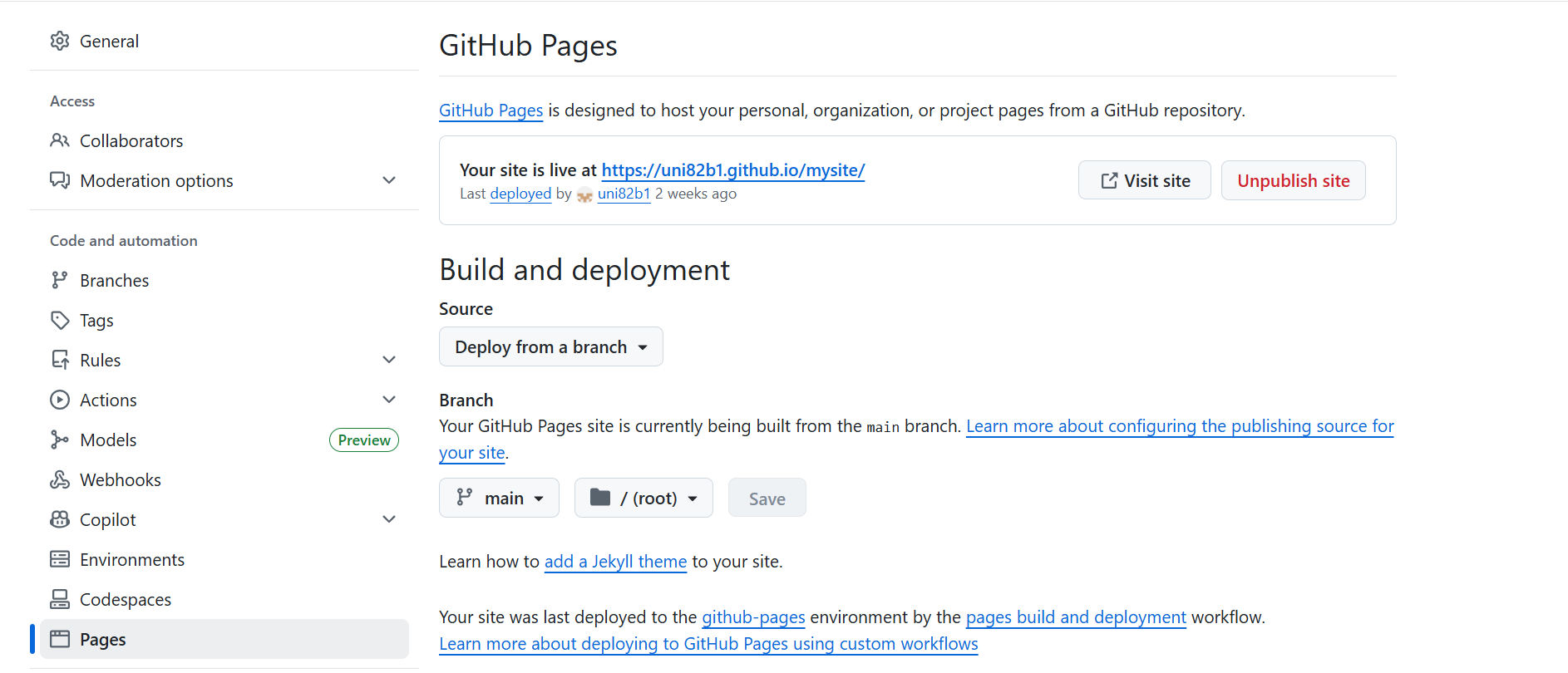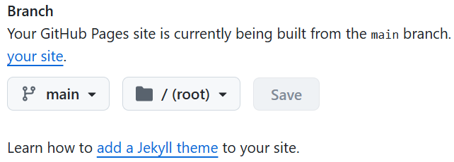 ファイルを上げたらSettingsのPagesからBranchの[None]を[main]に変えて